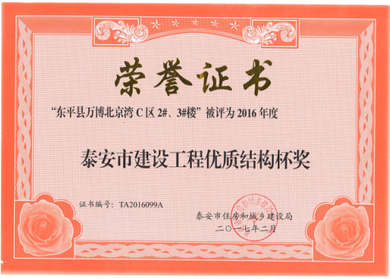 萬博·北京灣C區2#、3#樓評為2016年度泰安市優質結構杯