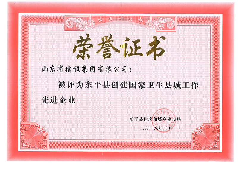 山東省建設(shè)集團(tuán)有限公司被評為東平縣創(chuàng)建國家衛(wèi)生縣城工作先進(jìn)企業(yè)